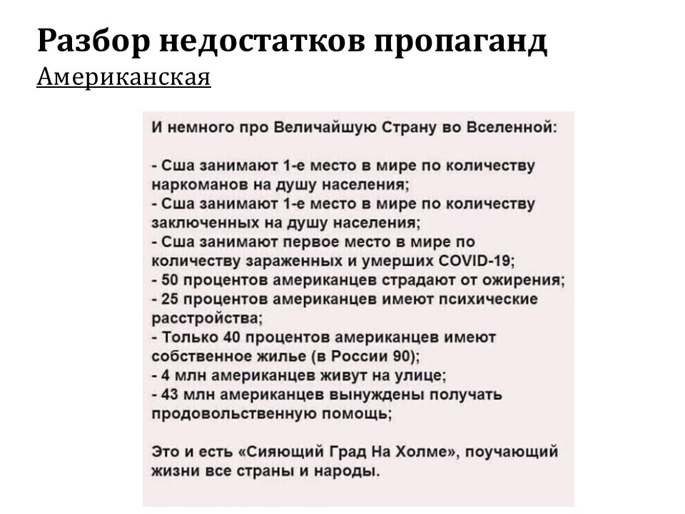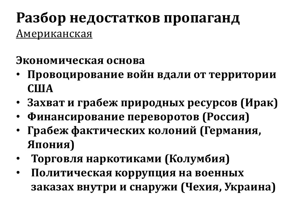 Экономическая основа американской пропаганды прежде всего провоцирование войн вдали от территории США. Приток финансового и интеллектуального капитала из зон военных конфликтов, продажа оружия – это приносит им основные деньги.