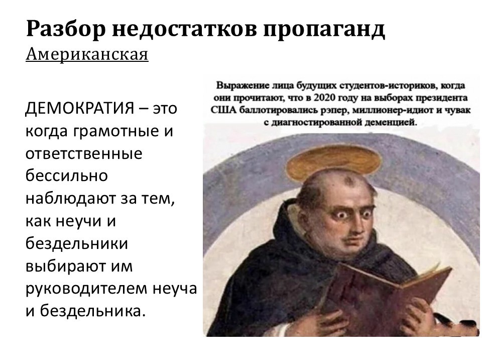 К американской демократии я отношу эту вот картинку. Здесь мелким текстом написано следующее: вот так будут выглядеть лица студентов, которые будут читать, что в 2020 году на выборах президента США баллотировались рэпер, миллионер-идиот и человек с диагностированной деменцией.