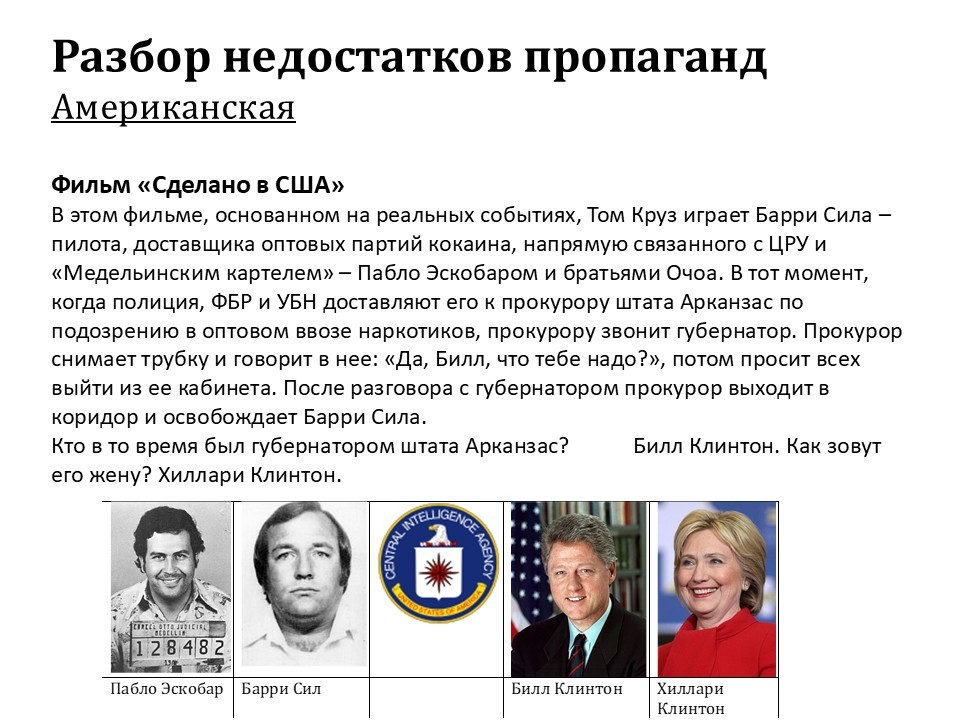 В этом фильме, основанном на реальных событиях, Том Круз играет Барри Сила – пилота, доставщика оптовых партий кокаина, напрямую связанного с ЦРУ и «Медельинским картелем» – Пабло Эскобаром и братьями Очоа. В тот момент, когда полиция, ФБР и УБН доставляют его к прокурору штата Арканзас по подозрению в оптовом ввозе наркотиков, прокурору звонит губернатор. Прокурор снимает трубку и говорит в нее: «Да, Билл, что тебе надо?», потом просит всех выйти из ее кабинета. После разговора с губернатором прокурор выходит в коридор и освобождает Барри Сила.