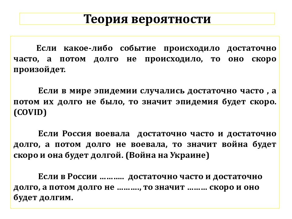 Но мы с вами должны исходить из науки. Наука – теория вероятности – говорит нам, что если какое-то событие происходило достаточно часто, а потом его долго не было, значит оно скоро будет. Чего бы это ни касалось: войны, инфляции, любого другого события. Теория вероятности нас не обманет.
