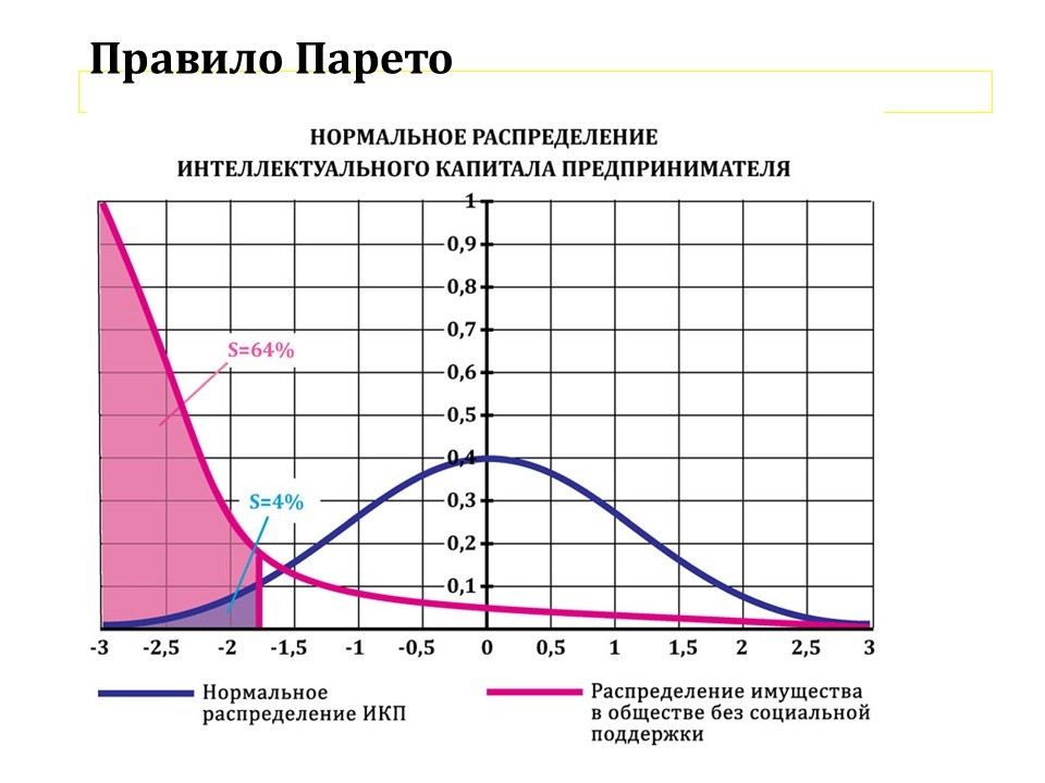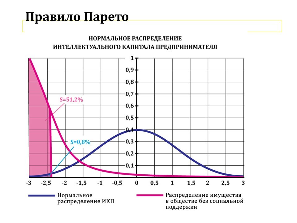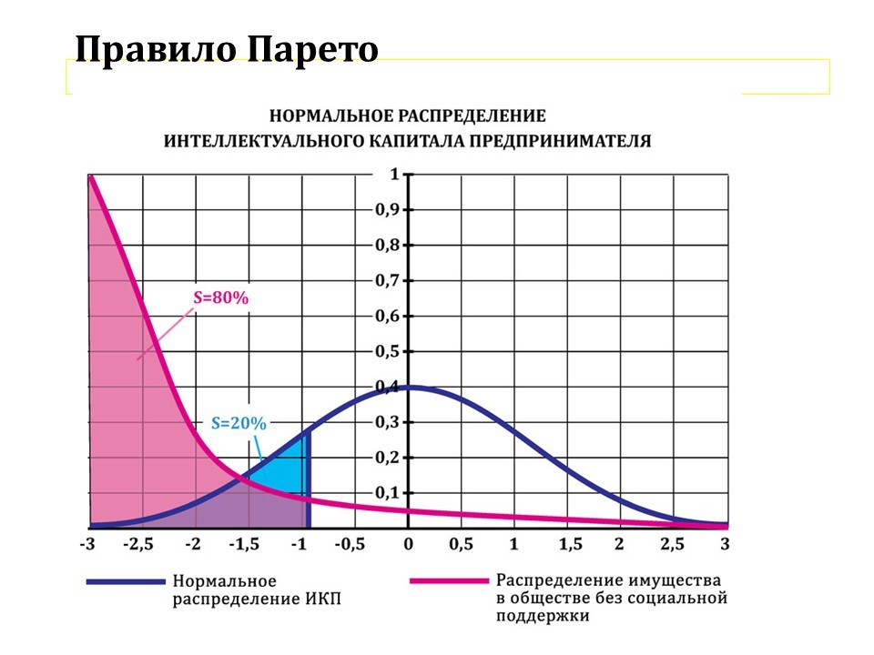 Если мы наложим правило Парето на нормальное распределение Гаусса, то мы увидим картинку, показанную на слайде. Синим закрашены: 20 % населения – это люди, более умные, чем средние. Эти 20 % людей делают 80 % работы, которая закрашена красным или розовым цветом. Вот так это выглядит в реальной жизни. Те люди, которые умнее остальных, совершают научные открытия, делают особо полезные дела, являются очень часто руководителями. Неорганизованные люди приносят гораздо меньше толку, чем те, кого организовали.