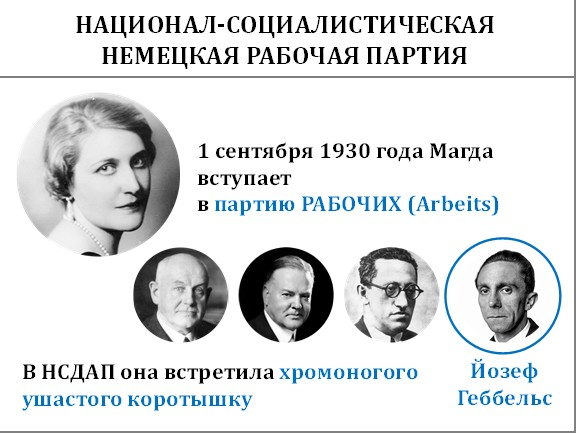Потом Магдалене надоело ничего не делать. Она – девушка активная – решила заняться какой-нибудь работой. И она вступила в партию рабочих, которая называлась Дойче Арбайтс Партай - ДАП. В дальнейшем эта партия стала называться НСДАП – Национал-социалистическая немецкая рабочая партия.