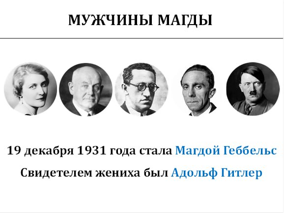 Но «есть нюанс». Свидетелем жениха был Адольф Гитлер. Немецкие историки считают, что Магда была женщиной Адольфа. И именно от Адольфа она родила пятерых детей, хотя юридически значилась женой Геббельса.