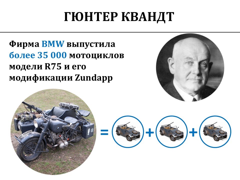 Из наиболее интересных контрактов BMW, которые открыто лоббировал Геббельс – и это никто не скрывает, – мотоциклы, которые вы видите в кино, на которых ездят немецкие мотоциклисты, назывались R75. Они были куплены вермахтом по цене такой же, сколько стоили три маленьких легковых автомобиля Kübelwagen, который обычно использовался для доставки солдат, патрулирования, разведки, штабных целей и буксировки лёгких пушек.