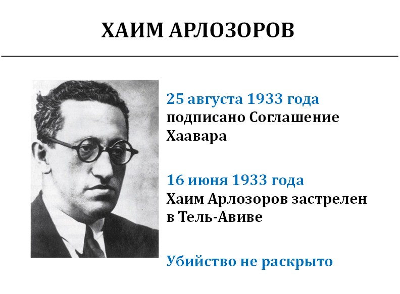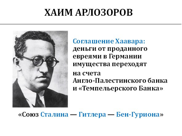 Соответственно, Хаиму Арлозорову тоже нашлось занятие. Его срочно вызвали из Израиля, который тогда назывался Палестиной, и он подготовил к заключению очень любопытное соглашение, которое на текущий момент жёстко критикуется всеми сионистами мира. Его называют пактом Сталина – Гитлера – Бен-Гуриона. Называется оно «Соглашение Хаавара».