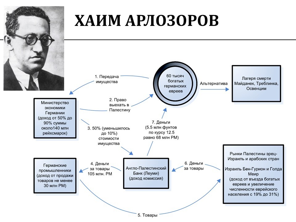 Суть его заключалась в том, что если какой-нибудь богатый германский еврей не хотел ехать в Майданек, Треблинку и Освенцим, то он мог отдать всё своё имущество министерству экономики Германии, после чего получал право выехать в Палестину. А половина стоимости его имущества министерством экономики Германии отдавалась товарами Англо-Палестинскому банку, который сейчас называется Банк Леуми, который, в свою очередь, должен был эти немецкие товары продать на территории Палестины или арабских стран и, соответственно, деньги, за вычетом своей комиссии, передать тем самым евреям, которые выезжали в Израиль.