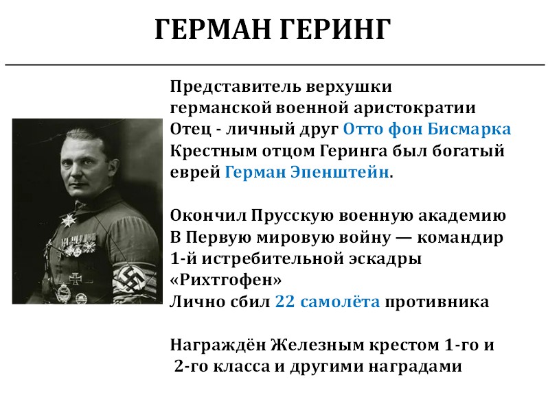 Он был из очень богатой аристократической семьи. Его отец был личным другом Отто фон Бисмарка, был рейхскомиссаром германской Африки, которая сейчас называется Намибия. Это была богатейшая страна, в которой семьей Оппенгеймеров добывались алмазы. Денег оттуда шло огромное количество. Потом отец Геринга умер, и сожителем его мамы стал богатый еврей Герман Эпенштейн, который стал крёстным отцом Германа, названного именно его именем. Он сохранил великолепные отношения с Герингом.
