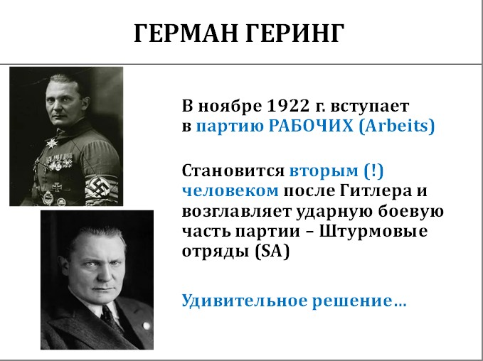 Герман Геринг стал официально вторым человеком после Гитлера и возглавлял то, что было до вермахта ударной частью НСДАП – штурмовые отряды Sturmabteilung. SA.