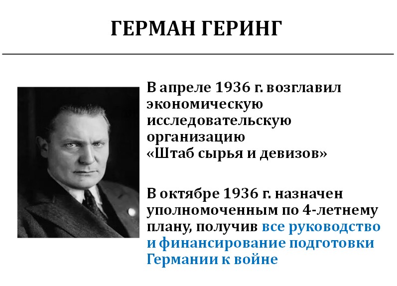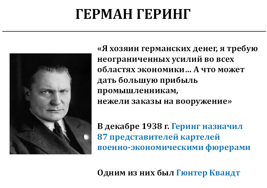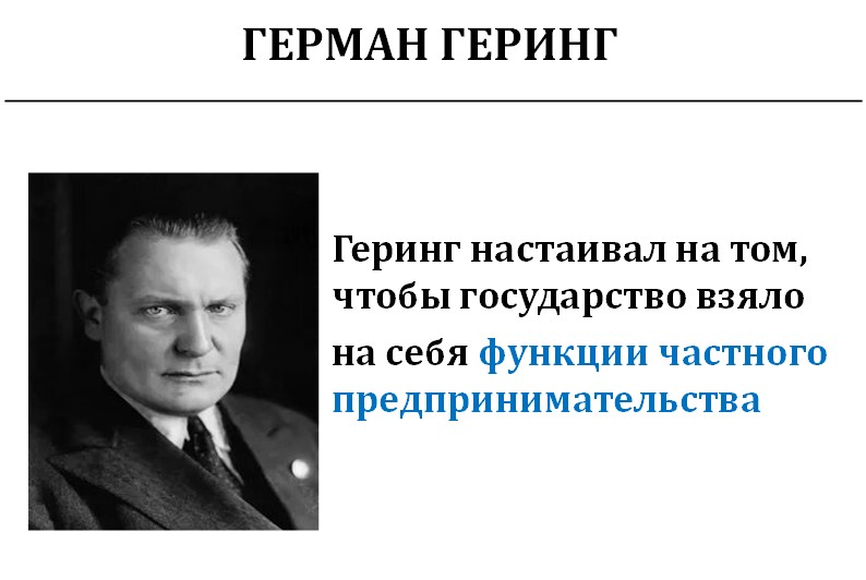 Он назначил 87 своих представителей военно-экономическими фюрерами. Именно через них деньги заходили в экономику. Геринг – автор высказывания: «Я хозяин германских денег. Я требую неограниченных усилий в милитаризации экономики и гарантирую промышленникам большую прибыль, которую дают только заказы на вооружение». Он сам признался, что будет финансировать проекты, дающие максимальную прибыль.