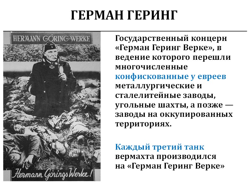 Потому что, когда находил людей, у которых можно отнять собственность – в основном евреев, – конфисковывал металлургические, сталелитейные заводы, угольные шахты. Потом всё это объединял в государственный концерн «Герман Геринг», где был директором. Официально зарплату там он получал мизерную, но если в его концерне производился каждый третий танк, то деньги там прокручивались колоссальные.