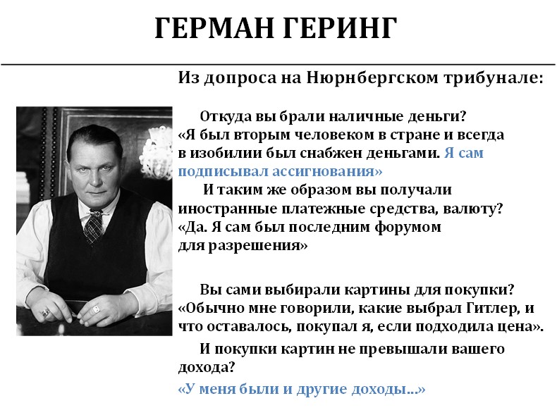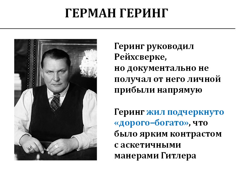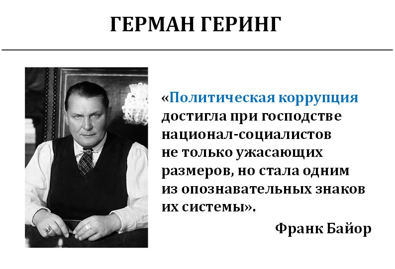 Высказывание, что политическая коррупция достигла гигантских размеров, было сделано именно в то время. То, что Геринг воровал деньги, было очевидно для всех в Германии того времени. Сейчас об этом почему-то говорят мало, но нам как раз на этом надо сконцентрировать усилия.