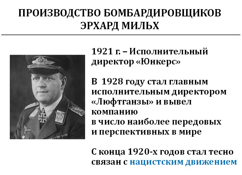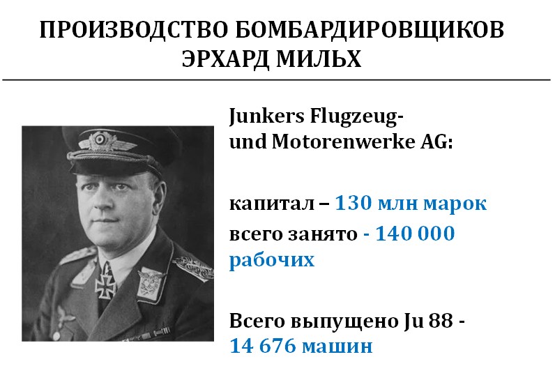 С этого момента Мильх управлял заводами Юнкерса. И половина всех бомбардировщиков Германии произведена в компании «Юнкерс». Финансирование шло через Мильха и Геринга и не уходило в сторону. Было выпущено 14 676 бомбардировщиков Юнкерс-88.