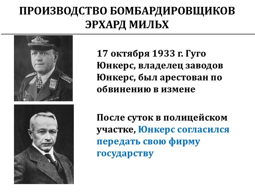 Брэнд «Юнкерс» все слышали. Самолёт Юнкерс-88 был одним из основных бомбардировщиков люфтваффе. Основателя этого предприятия, Гуго Юнкерса, профессора и истинного арийца вызвали в гестапо и немного поговорили. К утру он переписал все заводы на государство. Ничего не напоминает? Именно тогда эти методы были придуманы.