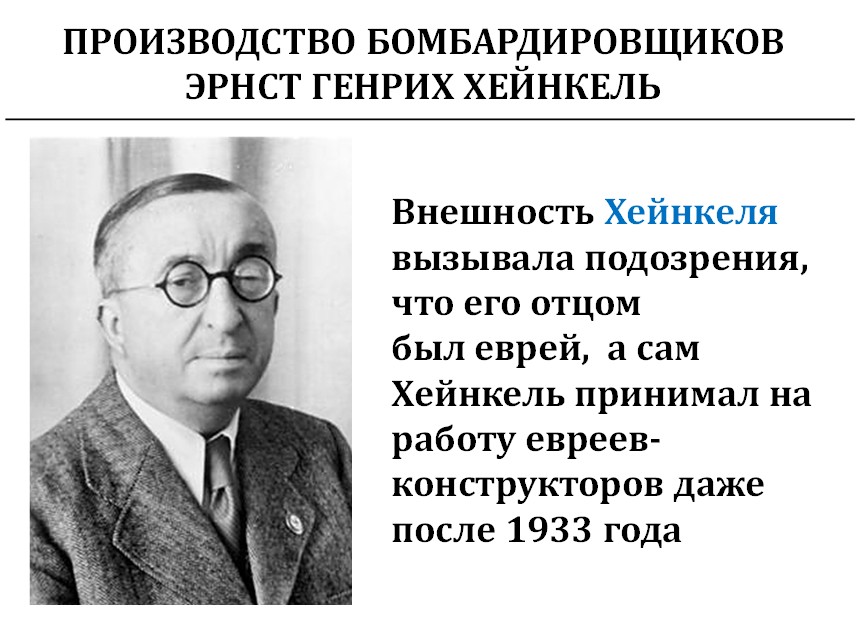 Его внешность вызывала подозрение, а сам он на свои заводы совершенно открыто брал еврейских конструкторов и рабочих, которые производили те самые бомбардировщики, которые потом бомбили те города, в которых погибли наши предки: деды, прадеды, бабушки, прабабушки.