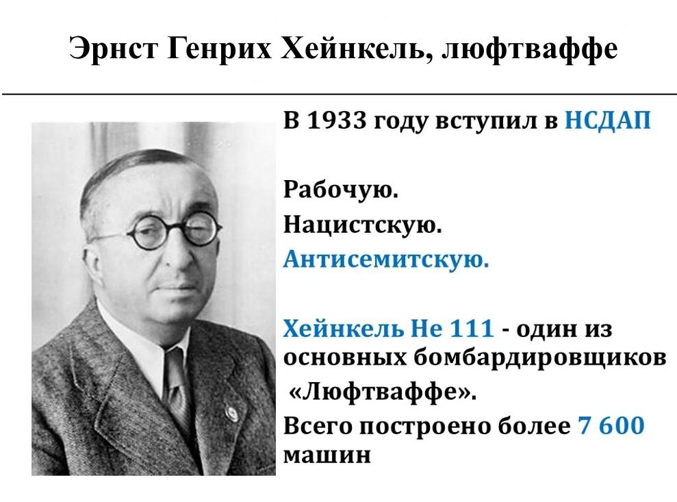 Эрнст Генрих Хейнкель – основатель этих заводов. На этой фотографии всё прекрасно: и нос, и значок НСДАП. Отдельно нос можно понять, отдельно значок НСДАП можно понять, но на этой фотографии всё вместе.