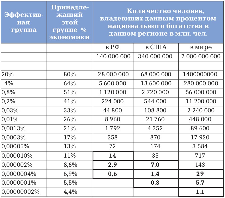 Данные выкладки подтверждает, видимо, ничего не опасающийся экс-глава аппарата госсекретаря США Колина Пауэлла Лоуренс Уилкерсон: «США насчитывают около 400 людей, чье общее состояние превышает триллионы долларов… Власть находится в руках примерно 0,001% людей»2.