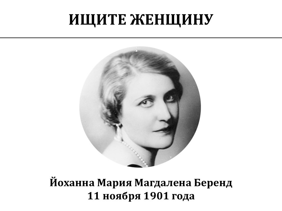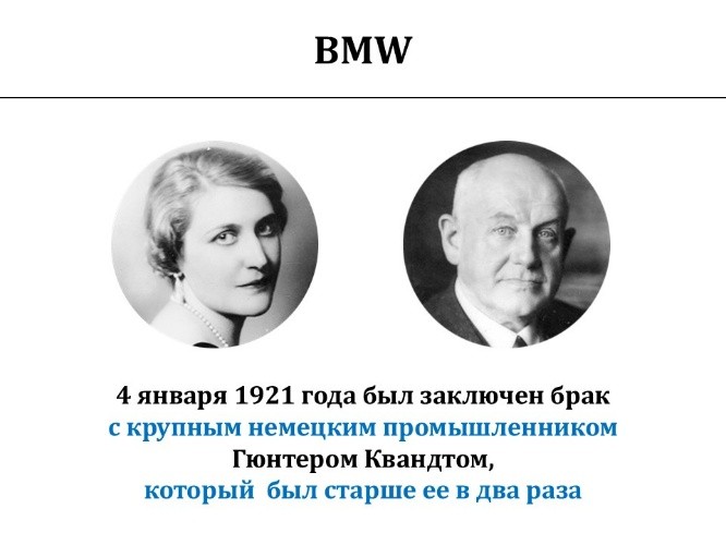 Начнём с девушки, которую звали Йоханна Мария Магдалена Беренд, которая родилась в 1901 году. Девушка была симпатичная. Когда ей было 18 лет, она возвращаясь в пансион с каникул из Берлина, познакомилась в купе поезда с достаточно крупным немецким промышленником по фамилии Квандт, который был существенно старше. Вышла за него замуж и стала Магдой Квандт. Эта фамилия известна до сих пор – она контролирует компанию BMW. Соответственно, Гюнтер Квандт тогда уже контролировал компанию BMW, которая была, несколько меньше, чем то, что она представляет собой сейчас.