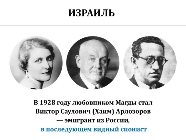 Таким образом, мы видим очень интересную связь, когда одна женщина имела твёрдые контакты одновременно с властными и финансово-промышленными кругами Германии, с властными и финансово-промышленными кругами Соединённых Штатов Америки, с идеологическими кругами сионизма. Именно не еврейства, а сионизма. Арлозоров – один из основателей государства Палестина. А замужем она была за Йозефом Геббельсом, который был рупором идеологии национал-социализма и антисемитизма.