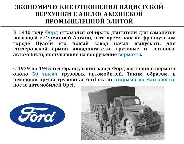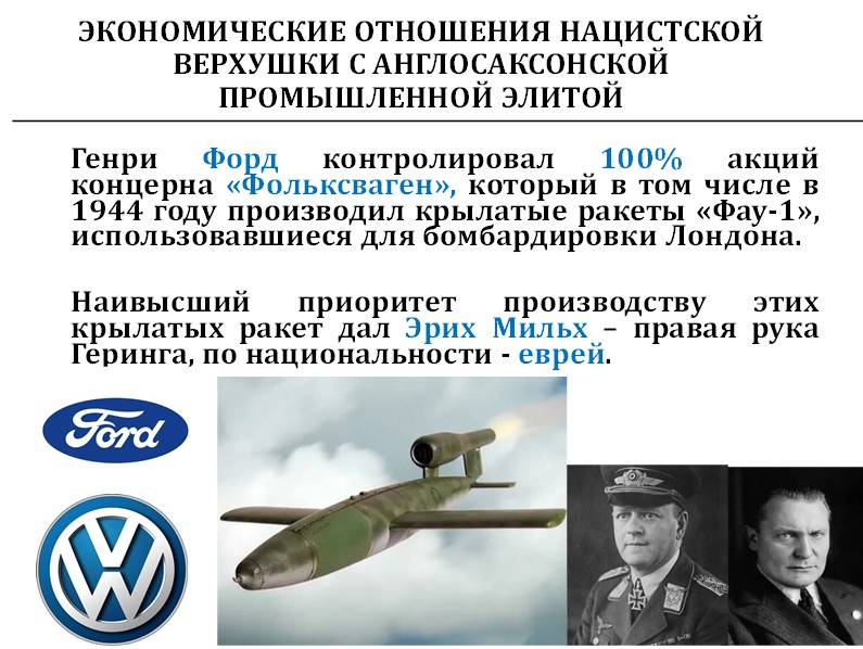 Форд контролировал 100 % «Фольксвагена», который производил, в том числе, крылатые ракеты Фау-1. Завод Форда в Кёльне работал всю Вторую мировую войну, производил грузовики для вермахта. Форд был вторым поставщиком грузовиков для вермахта официально. Заводы Форда в Кёльне ни разу не бомбили. Кёльн разбомбили вдребезги, но на завод Форда не упала ни одна бомба.
