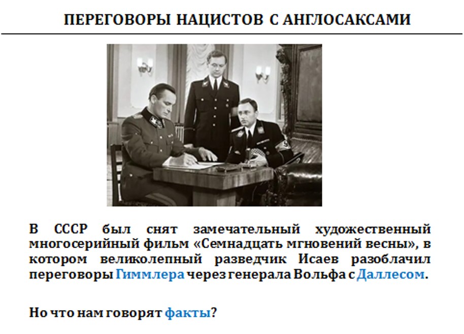 Все вы смотрели великолепный фильм «Семнадцать мгновений весны», где наш замечательный разведчик препятствует переговорам англосаксов и нацистской верхушки.