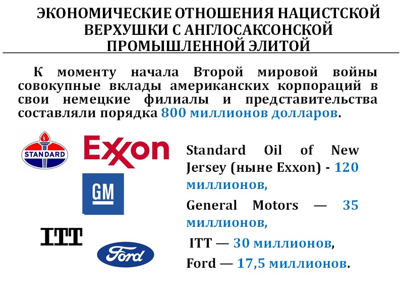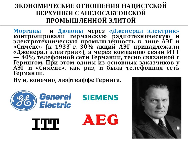 Морганы и Дюпоны через «Дженерал Электрик» контролировали «Сименс» и «АЕГ» – две крупнейших компании, а через IT&T контролировали 40 % телефонной сети Германии. Технологии связи для люфтваффе Геринга тоже были проданы американскими компаниями.