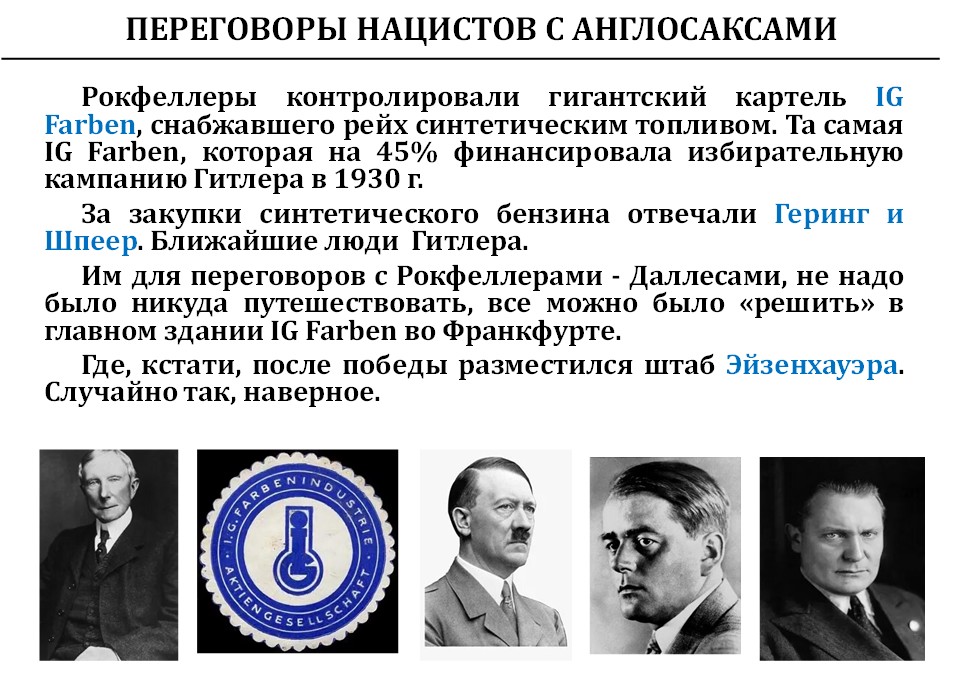 Рокфеллеры контролировали производство синтетического топлива, за которое отвечали Геринг и Шпеер. Соответственно, им не нужно было никуда путешествовать, чтобы вести переговоры с Рокфеллерами. Это можно было сделать в главном здании IG Farben во Франкфурте. Кстати, именно в этом здании потом разместился штаб войск Эйзенхауэра. Ну, случайно, наверное, больше негде было. Вот только это единственное место подходило для штаба Эйзенхауэра во всей Европе после победы.
