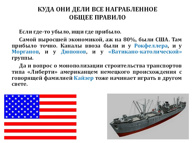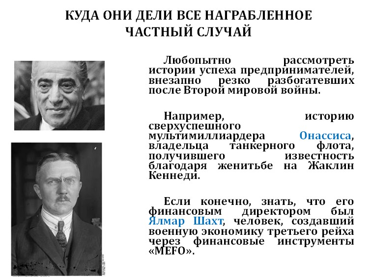 После войны внезапно ниоткуда появился большой танкерный флот сверхуспешного мультимиллиардера Онассиса, который потом ещё женился на бывшей жене президента Кеннеди, Жаклин Кеннеди. И никто не понимал, откуда деньги у этого непонятно откуда взявшегося грека, конечно, если не знать, что его финансовым директором был Ялмар Шахт, который до этого возглавлял Рейхсбанк и своевременно уволился перед началом Второй мировой войны, но до этого раскрутил всю военную экономику Германии эмиссией векселей.
