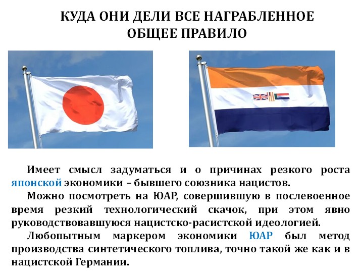 Кроме того, был резкий рост японской экономики, в которую, видимо, кто-то инвестировал большие деньги. Мы можем предположить, что это были американские деньги, но, скорее всего, под флагом Америки был заход тех же самых немецких денег. Был резкий скачок в развитии экономики ЮАР, которая, кстати, находится рядом с Намибией, бывшей колонией Германии, которой в начале XX века управлял папа Германа Геринга.
