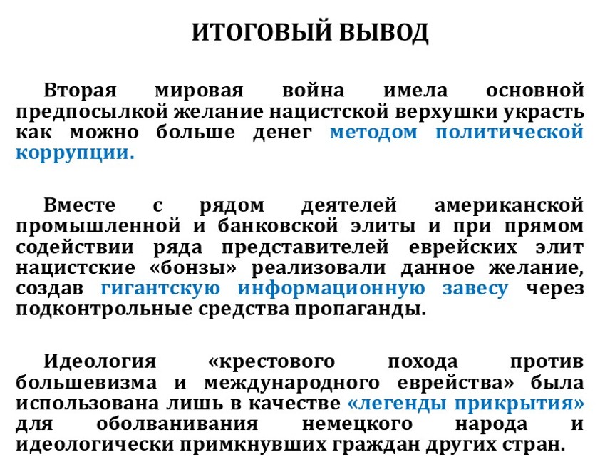 Когда мы анализируем Третий рейх, мы можем брать всё это и чётко, как кальку, перекладывать на Украину. Там точно такая же идеология прикрытия под названием «русофобия», которая помогает Зеленскому и всей его шайке воровать деньги на войне. Вчера Трамп обвинил Байдена в откатах с Украины открыто. Как будто никто этого не знал раньше. Ничего не изменилось в истории.