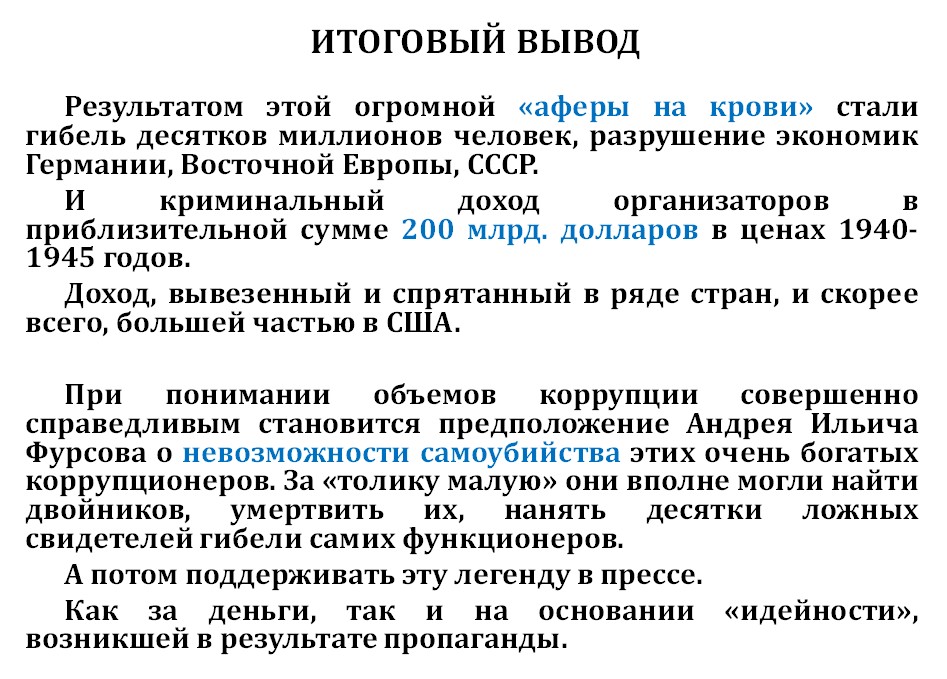 Соответственно, очень сложно предположить, что люди, укравшие такое количество денег, взяли и покончили жизнь самоубийством. Гораздо легче предположить, что они нашли каких-то двойников и их сожгли. Какую-то стоматологическую карту Гитлера несложно и по новой написать.