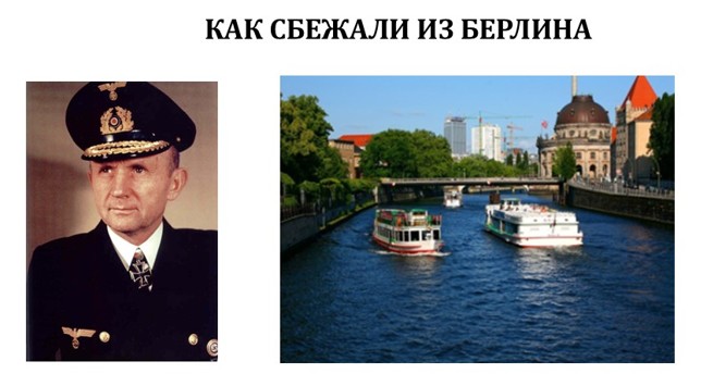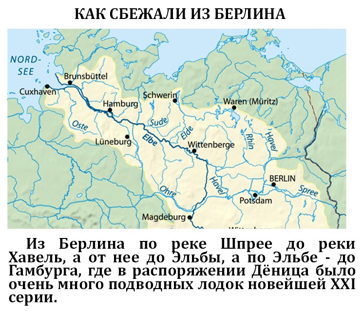 При этом никто никогда не рассказывает, что через город Берлин течёт полноводная речка под названием Шпрее. Карл Дёниц был самым преданным Гитлеру человеком и до последнего оборонялся в устье Эльбы. По этой Шпрее можно было легко уплыть на маленькой подводной лодке типа Seehund, которая была у немцев, или на торпедных катерах, которые назывались «шнелльботы».