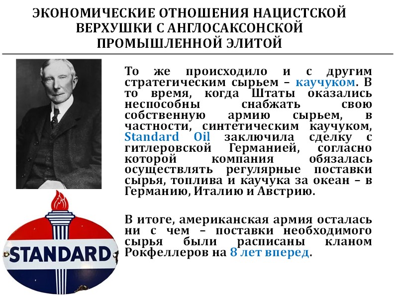 Итак, «И. Г. Фарбениндустри», основной производитель синтетического бензина, контролировался де-факто Рокфеллерами. Поэтому, чем больше немецкие танки ездили на Восточном фронте, тем больше денег было у американского промышленника Рокфеллера.