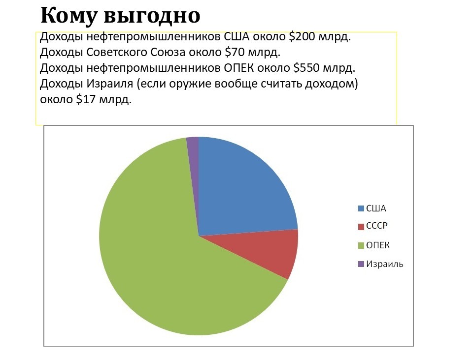 Если бы арабы, обладавшие десятикратным численным преимуществом и в людях, и в технике, победили Израиль, они не могли бы создать экономический картель. У них не было бы политического повода. А так, проиграв войну, они смогли сформировать политический повод для создания экономической организации ОПЕК и для прекращения поставок нефти в Европу и в Америку.