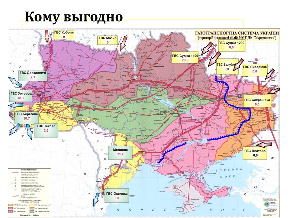 Посмотрим карту Украины. Синей линией на ней показаны те позиции, которые Россия заняла в первые месяц-два после своего наступления. Если вы обратите внимание, то эти позиции на севере пересекали магистральный газопровод, а на юге, в Херсоне, подходили к нему практически вплотную, угрожая боевыми действиями на газопроводе.