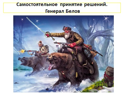 Генерал Белов на этом не остановился. Решил: «Зачем возвращаться назад? Там кормят плохо, всё время начальство дурные приказы выдаёт».