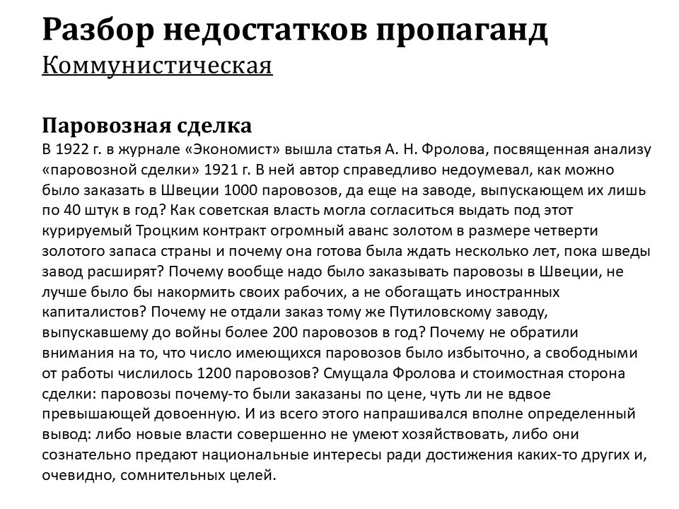 Соответственно, для чего всё это делалось? Мы должны обратить внимание на следующий факт. В 1922 году в журнале «Экономист» видный экономист того времени – Фролов – разбирал так называемую паровозную сделку, которую заключили бывший народный комиссар путей сообщения Троцкий и действующий народный комиссар путей сообщения Дзержинский со шведскими предприятиями: они заказали тысячу паровозов на том заводе, который мог производить только 40 паровозов в год.